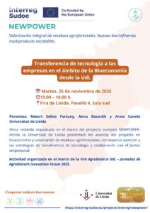 El próximo 25 de noviembre de 2025, la Universitat de Lleida (UdL) participará en las Jornadas de Agrobiotech Innovation Forum 2025, en el marco de la Fira Agrobiotech UdL, con la mesa redonda titulada “Transferencia de tecnología a las empresas en el ámbito de la Bioeconomía desde la UdL”.