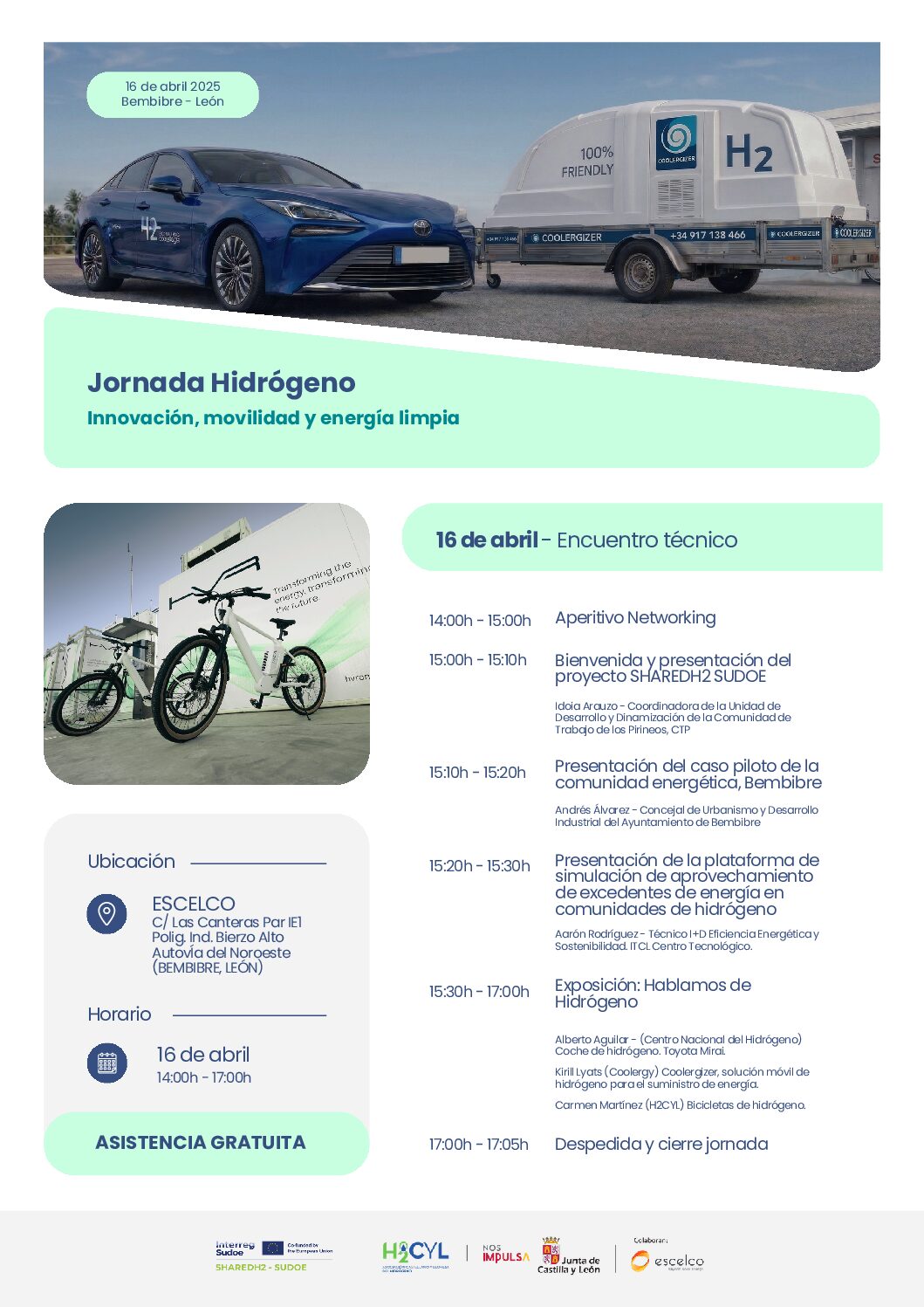 - 15h30-17h00 Exposición: Hablamos de Hidrogeno. Con la intervención de: Alberto Aguilar (Centro Nacional del Hidrógeno) Coche de hidrógeno. Toyota Mirai. Kirill Lyats (Coolergy)Coolergizer, solución móvil de hidrógeno para el suministro de energía. Carmen Martínez (H2CYL), bicicletas de hidrógeno.