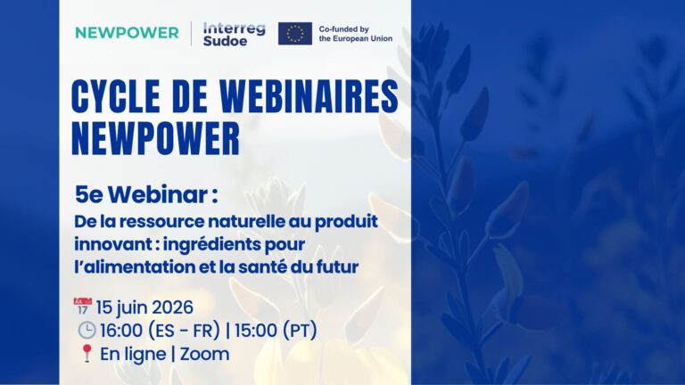 Le 15 juin 2026, le projet NEWPOWER organisera le webinar « De la ressource naturelle au produit innovant : ingrédients pour l’alimentation et la santé du futur », centré sur la valorisation de sous-produits agroindustriels et agroforestiers pour l’obtention de composés bioactifs avec des applications en alimentation et en santé.