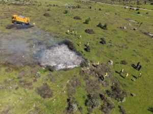 La jornada incluyó la quema experimental por montones de Cytisus multifloros, conocida popularmente como «escoba blanca», una especie arbustiva frecuente en los montes del suroeste peninsular. A lo largo de aproximadamente tres horas, se quemaron de forma secuencial nueve montones de vegetación con intervalos de entre 15 y 20 minutos, generando un entorno controlado y reproducible para la toma de datos en condiciones reales. En la preparación del material vegetal y en la ejecución y caracterización de las quemas participaron la Brigada de Refuerzo en Incendios Forestales (BRIF), el Equipo de Prevención Integral de Incendios Forestales (EPRIF) y el Equipo de Prevención y Análisis de Incendios Forestales (EPAIF), dependientes del Ministerio para la Transición Ecológica y el Reto Demográfico (MITECO), y el Instituto de Ciencias Forestales (ICIFOR-INIA) del CSIC.