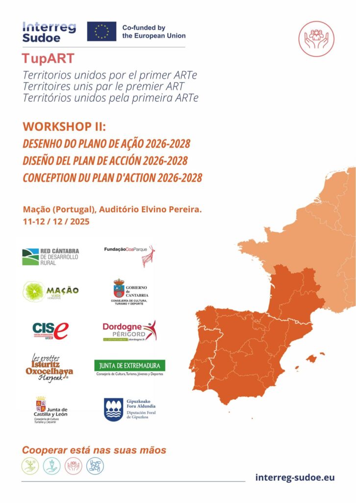 El proyecto europeo TupART – Territorios Unidos por el Primer Arte, cofinanciado por el programa Interreg Sudoe, celebrará su Segundo Taller los días 11 y 12 de diciembre de 2025 en el Auditório Elvino Pereira de Mação, Portugal. Bajo el título “Diseño del Plan de Acción 2026-2028”, el encuentro reunirá a socios institucionales de España, Francia y Portugal para definir las próximas estrategias de cooperación en torno al arte rupestre y el desarrollo rural.