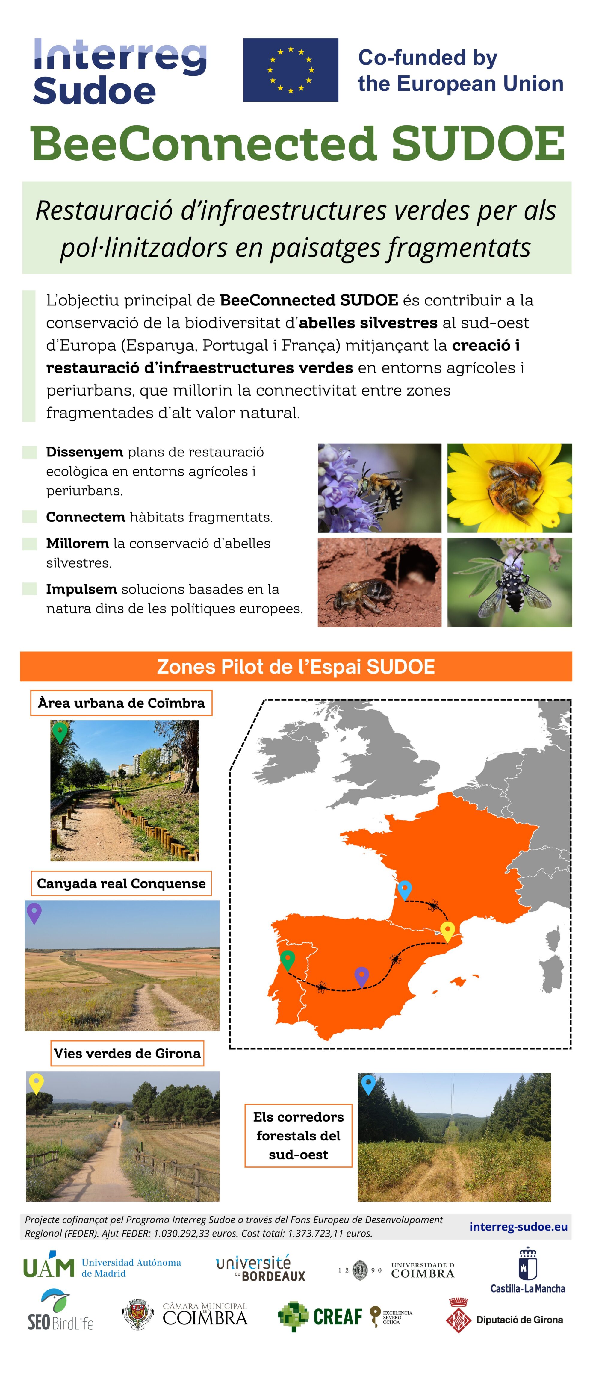 BeeConnected SUDOE diseña acciones y testa estrategias de restauración ecológica en cuatro zonas piloto, para abordar la falta de conectividad de polinizadores silvestres en paisajes agrícolas y periurbanos fragmentados, en línea con los principios del Pacto Verde Europeo.